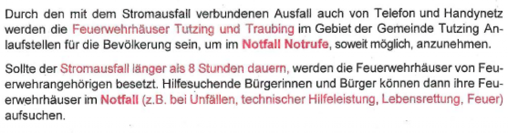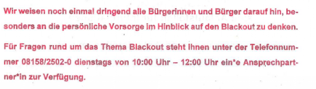 Für die Angelegenheit „Blackout“ wurde ein eigener Arbeitskreis aus Gemeinderäten, Bürgermeisterin, Verwaltung und Feuerwehr gegründet. Dieser Arbeitskreis hat sich zweimal getroffen und die Ergebnisse dem Ausschuss in der nichtöffentlichen Sitzung im November vorgetragen. Nichtöffentlich deshalb, weil es zum einen um Anschaffungen und damit verbundene Ausschreibungen ging und zum anderen, um die Ausarbeitung einer Information an die Bürger über die Tutzinger Nachrichten. Diese Bürgerinformation wurde bewusst nichtöffentlich diskutiert, damit nicht schon vor der Veröffentlichung in den Tutzinger Nachrichten Informationen aus dem Zusammenhang gerissen und die Bürger*innen unnötig in Panik versetzt bzw. falsche Schlüsse gezogen werden. Zudem mussten in der Zeit zwischen Erstellung der Mitteilung und Veröffentlichung noch wichtige Dinge geklärt und Anschaffungen getätigt werden.