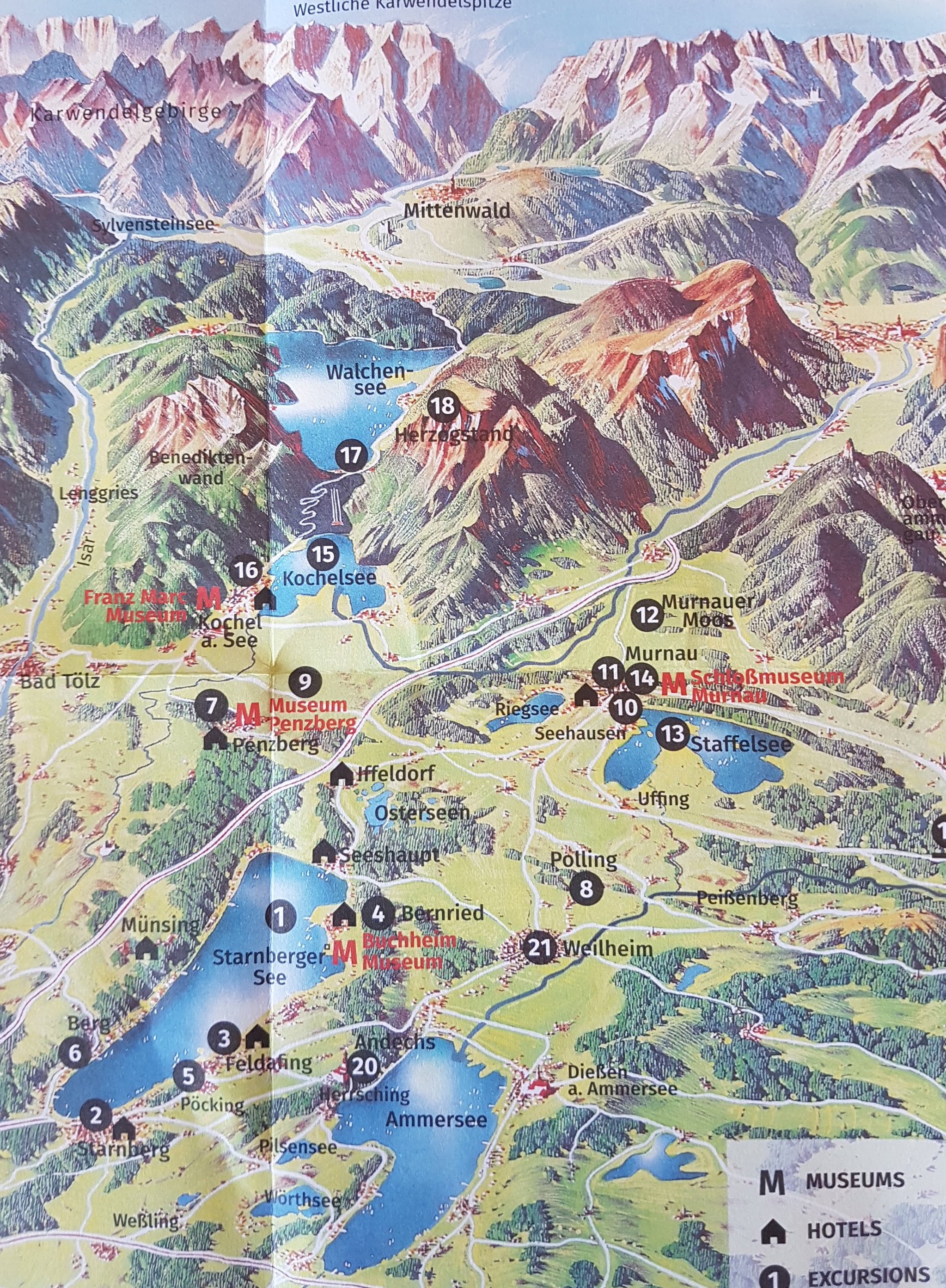 Das Wortspiel ist ideenreich: „MuSeenLandschaft Expressionismus“ heißt ein Flyer, der auf den „Kunst- und Naturgenuss zwischen München und dem Alpenrand“ aufmerksam macht. In dem von einer Firma Wengmann Kulturmanagement gestalteten Faltblatt finden Besucher Hinweise nicht nur auf Museen, Schlösser und andere kulturelle Einrichtungen, sondern auch auf alle möglichen Orte in dieser Region samt Hotels. Am Starnberger See stehen Berg, Bernried, Feldafing, Münsing Pöcking und Starnberg auf einer kleinen abgebildeten Karte: