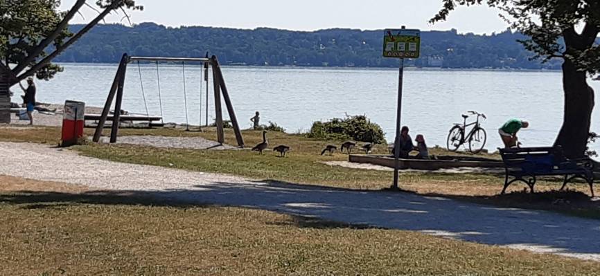 Einträchtiges Miteinander von Gänsen, Kindern und Erwachsenen kann man dieser Tage oft auf den Tutzinger Uferpromenaden beobachten. Die Gänse tummeln sich beispielsweise gern mitten auf dem Spielplatz an der Brahmspromenade. Dort und auf den angrenzenden Wiesen verrichten sie auch ihre Geschäfte. Mit ihren Hinterlassenschaften sind die Tiere aber nicht allein - das können die Menschen auch ganz gut.