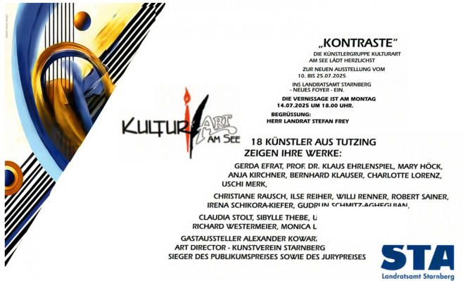 Ein visuelles Erlebnis, das Gegensätze in der Kunst erlebbar macht und zu einer neuen Einheit führt beim Betrachten: Das zeigt eine neue Ausstellung der Tutzinger Künstlergruppe KulturArt am See im Landratsamt Starnberg. Von Schwarz-weiß bis zum Komplementärklang, inspiriert durch Johannes Itten, aktuelle künstlerische Impulse und die Wissenschaft. Bei der gut besuchten Vernissage gestern Abend sind die im "Neuen Foyer" des Landratsamt ausgestellten Werke auf großes Interesse gestoßen. Wir berichten demnächst ausführlich über die Ausstellung,
