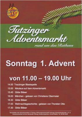 Darüber hinaus gibt es Musik, Erzählungen und mehr. Um 14 Uhr tritt die Traubinger Blaskapelle auf. Um 15 Uhr macht der Nikolaus seine Runde über den Markt. Um 15.45 Uhr spielen die Bläser von der Tutzinger Gilde. Um 16 Uhr liest Christiane Obermaier Märchen vor. Die Gilde-Bläser spilelen um 16.30 Uhr noch einmal. Um 17 Uhr trägt Thorsten Otto - wie schon im vorigen Jahr - eine Weihnachtsgeschichte vor. Und um 17.30 Uhr sind die Gilde-Bläser noch einmal an der Reihe.