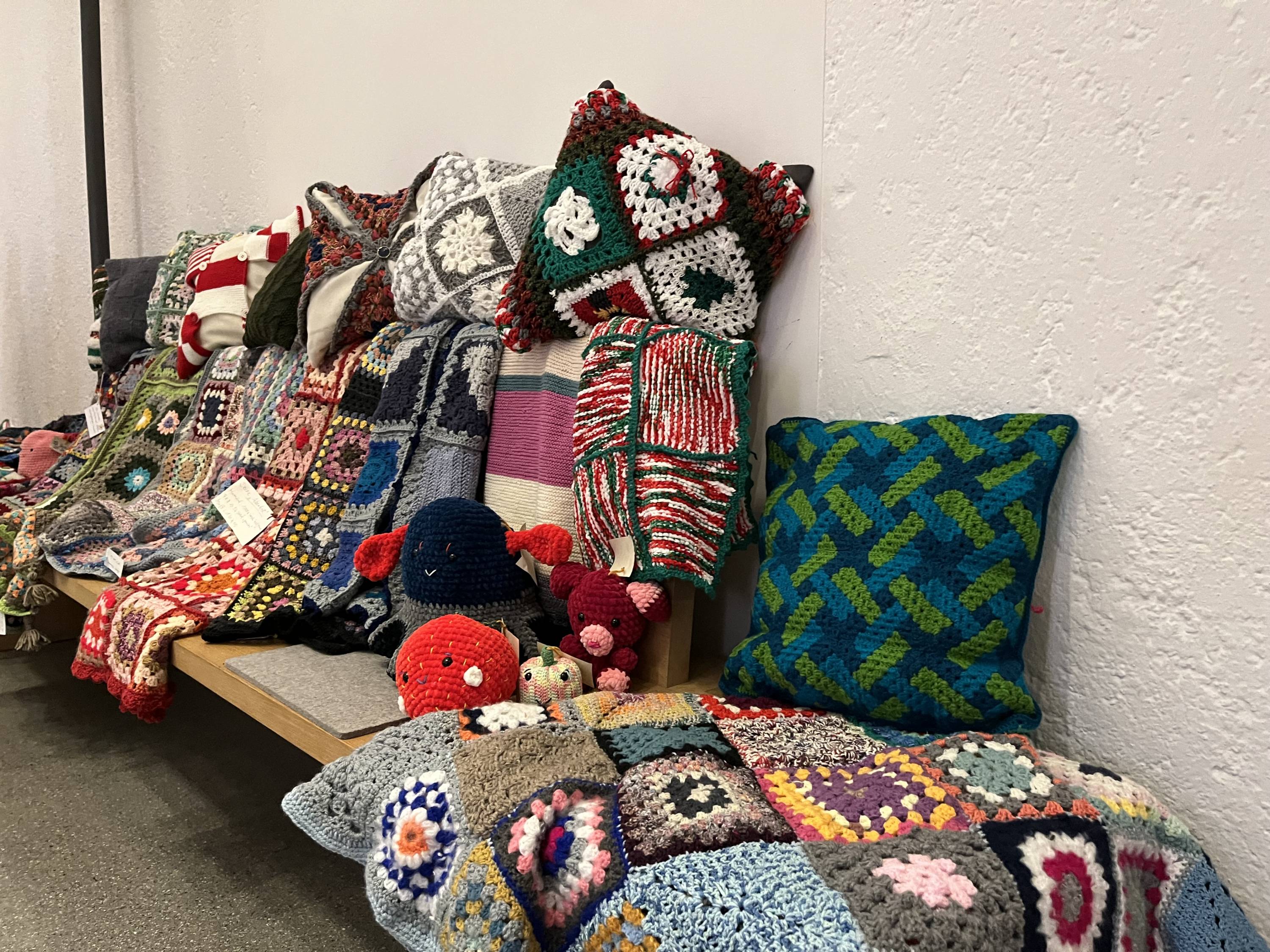 Decken, Kissen, Schals, Taschen, Ponchos… Darüber hinaus Kleinigkeiten wie Dekoration, Häkeltiere, Socken, Mützen sowie Kinderkleidung können gegen Spende abseits der Versteigerung erworben werden…