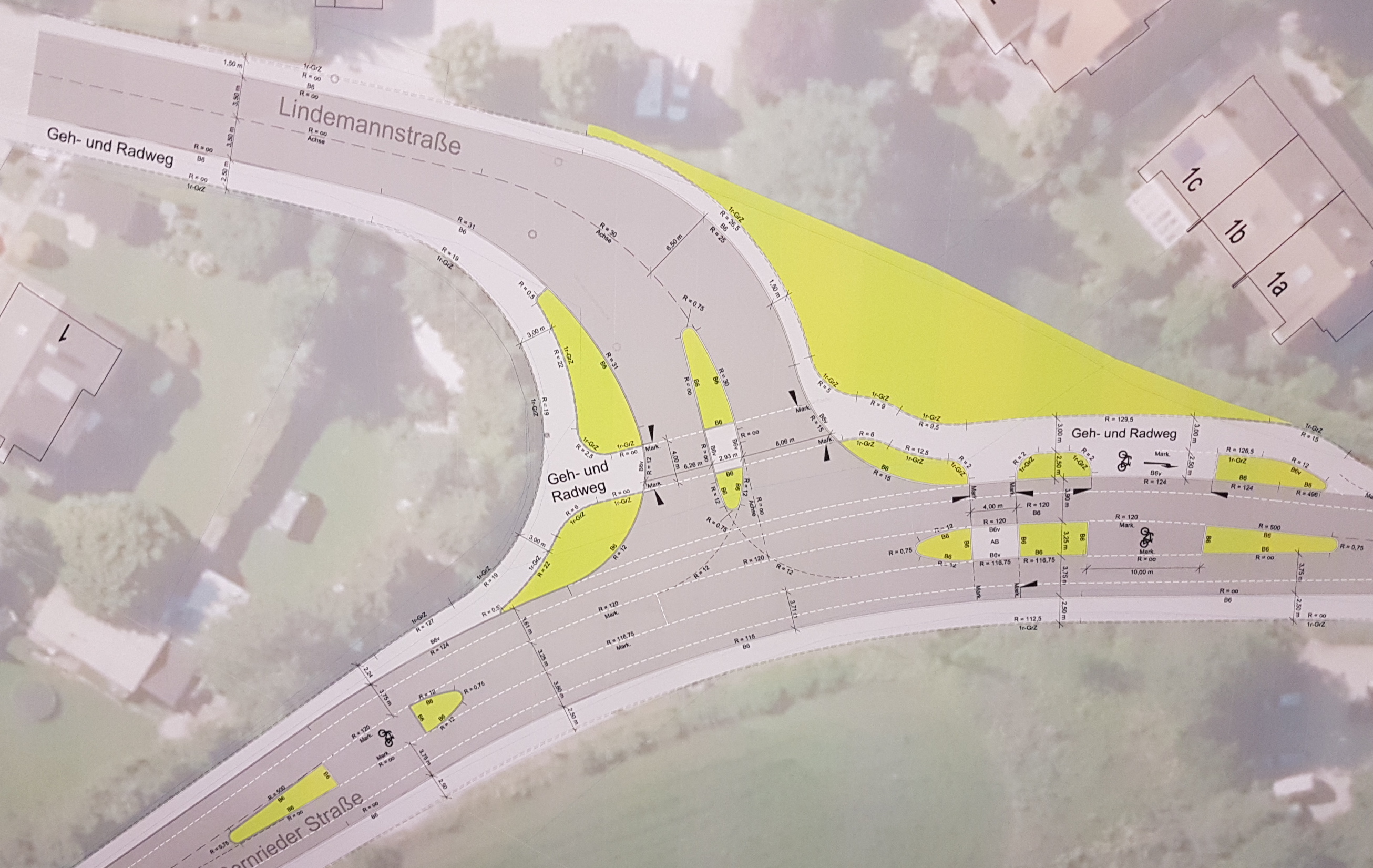 Beim Bürgerforum wurden die überarbeiteten Pläne für die Straßensanierung und -umgestaltung vorgestellt. Die Entwürfe zeigen unter anderem Details einer Kreisverkehrs- und einer Einmündungslösung dort, wo die Lindemannstraße auf die Hauptstraße trifft. Zu erkennen sind auf den Plänen auch die Geh- und Radwege bei den verschiedenen Varianten. Neu gestaltet werden sollen im Zuge der Umbauarbeiten auch der Bereich bei der Zufahrt zum Einkaufszentrum an der Lindemannstraße und die gegenüber abzweigende Bräuhausstraße, deren Einfahrt verengt werden soll.