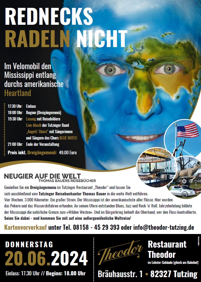 Für seine Veranstaltung am Donnerstag dieser Woche, dem 20. Juni 2024, im Restaurant Theodor hat sich der Tutzinger Reisebuchautor Thomas Bauer vor Ort Verstärkung geholt: Mehrere Sängerinnen und Sänger des Tutzinger Chors BLUE NOTES werden den umtriebigen Abenteurer begleiten. Um 18 Uhr gibt es zunächst ein Dreigängemenü mit US-amerikanischem Touch. Anschließend präsentiert Thomas Bauer im vierten Stock die unglaublichsten, witzigsten und spannendsten Momente seiner Reise den Mississippi entlang - im Velomobil! Dabei zeigt er spektakuläre Reisebilder und wird nicht nur von seiner Band musikalisch unterstützt, sondern auch von mehreren Sängerinnen und Sängern des Tutzinger Chors BLUE NOTES.