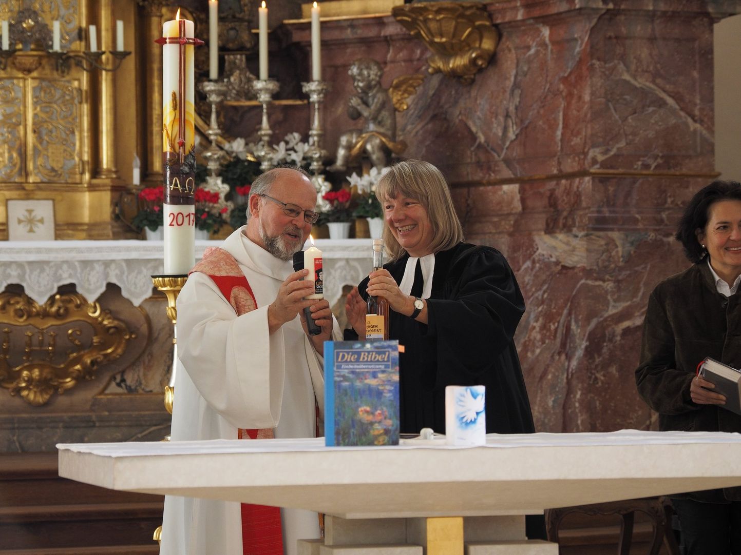 Bei dieser Gelegenheit hoben die beiden Pfarrer zum Gelächter der Gläubigen die Spiritualität noch in weiterer Form hervor. Ulrike Wilhelm überreichte ihrem katholischen Kollegen eine ganz neu kreierte Flasche „Tutzinger Ökumenegeist“. Pfarrer Brummer dankte ihr mit einer Flasche Roncalliwein. Wie sich beim gemeinsamen Mittagessen im Roncallihaus herausstellte, wohnt der evangelischen Flasche ein mächtiger Geist inne: Er bringt es auf stolze 55 Prozent! Spiritualität kommt ja vom lateinischen spiritus, also auch Hauch – und den gab dann manch einer der Probanden spontan von sich.