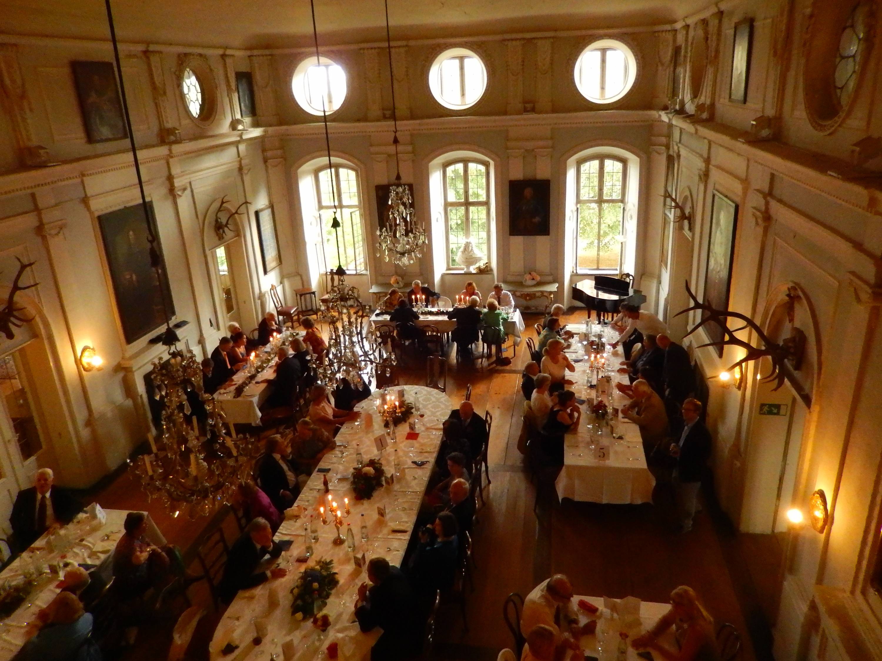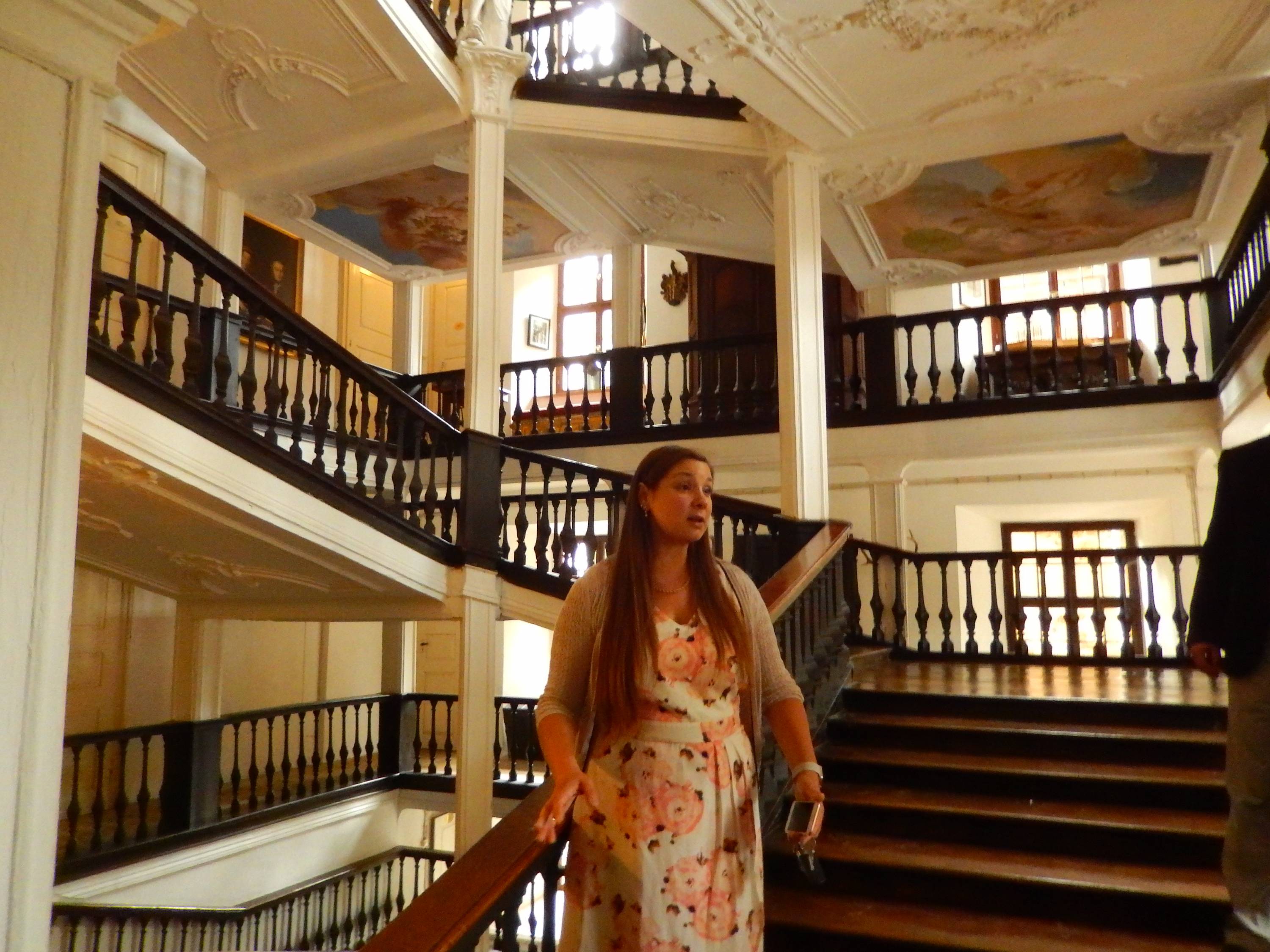 Nach dem festlichen Mittagessen wurden im Hof des Schlosses Hohenstadt, das neben der Schlosskirche liegt, Fotos der großen Festgesellschaft geschossen. Im Mittelpunkt standen natürlich das Jubelpaar Johannes Graf Gorcey und Maria Gabriele Gräfin Gorcey sowie die Inhaber des Anwesens, Reinhard Graf Adelmann und seine Frau, Anne Gräfin Adelmann. Die aus den USA stammende Gräfin Anne führte den Kirchenchor temperamentvoll und charmant durch das barocke Schlossgebäude, das vor allem durch das imposante Treppenhaus auffällt. Die auf den Stockwerken frei aufliegenden Treppen bestechen vor allem durch leicht begehbare, flache Stufen, die früher, wie die Gräfin erklärte, den Reichtum einer Familie demonstrieren sollten. Ein derartiges Treppenhaus findet man heute nur noch in der Würzburger Residenz. Bei der Führung lernte der Kirchenchor auch die große Herausforderung kennen, ein solch imposantes Anwesen zu erhalten. Die junge Gräfin Anne wies klar auf diese Problematik hin und deutete Lösungen an, wie die Erhaltung des Schlosses finanziert werden könnte.