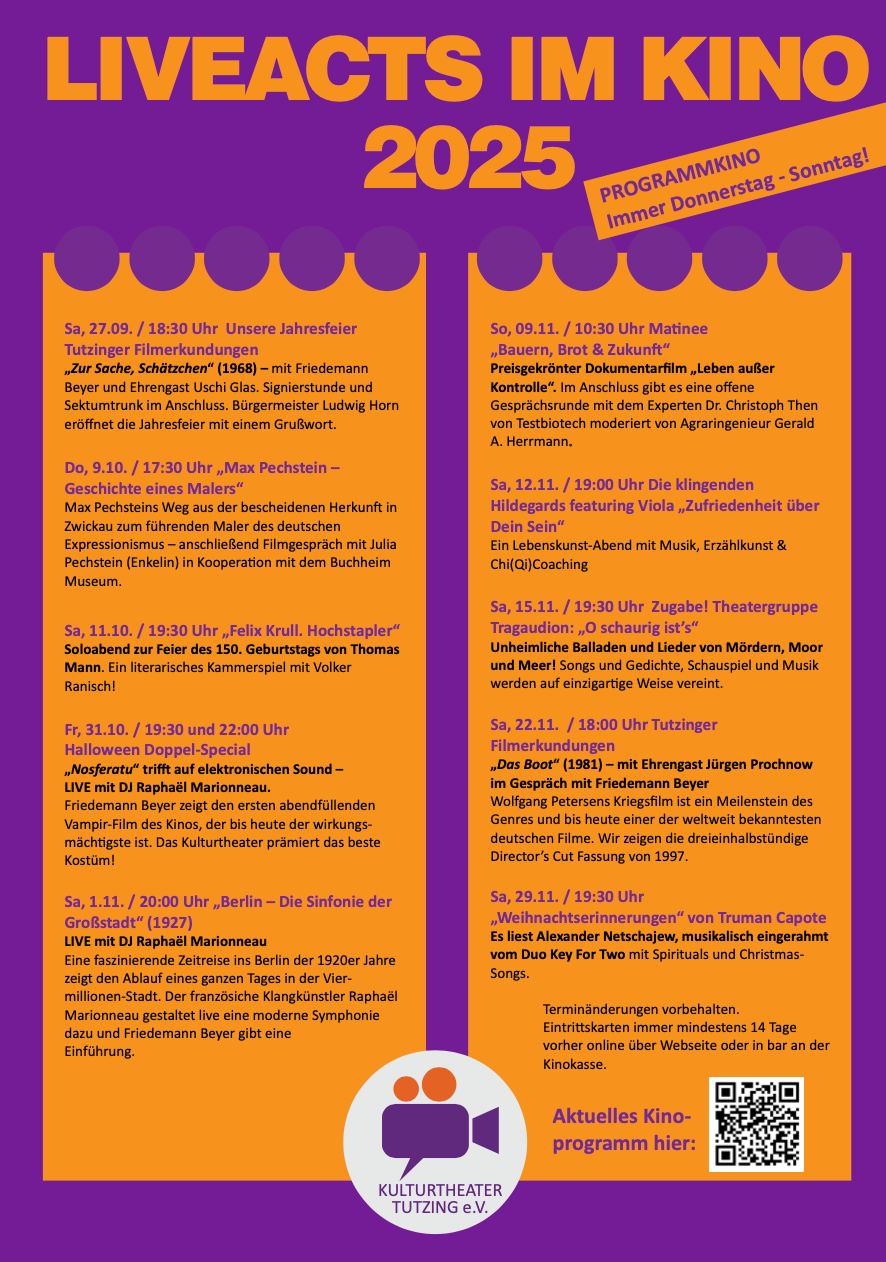 Und hier geht es zum ersten Kinoprogramm der Spielsaison 2025/26: https://kulturtheater-tutzing.de/