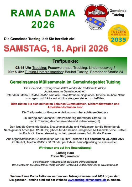 Bei schlechter Witterung wird das Rama Dama abgesagt. Aktuelle Informationen sollen spätestens am Freitag vor dem Termin auf der Homepage www.tutzing.de veröffentlicht werden.