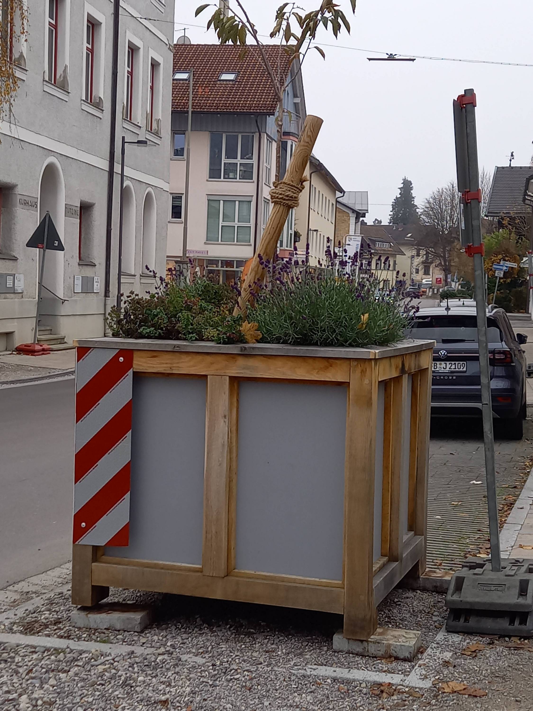 Da die Tröge im Verkehrsraum platziert werden, sind sie sehr massiv ausgeführt. Am Dienstag wird der Gemeinderat über Bepflanzung, Beleuchtung und Möblierung beraten. Da es in der Vergangenheit immer wieder Diskussionen über die Anzahl der Bäume gab, möchte die Verwaltung mit den aufgestellten Trögen veranschaulichen, welches Volumen für Bäume in Pflanztrögen notwendig ist. (Falls neben den bisherigen ebenerdigen Flächen noch zusätzliche überirdische Flächen angedacht werden)