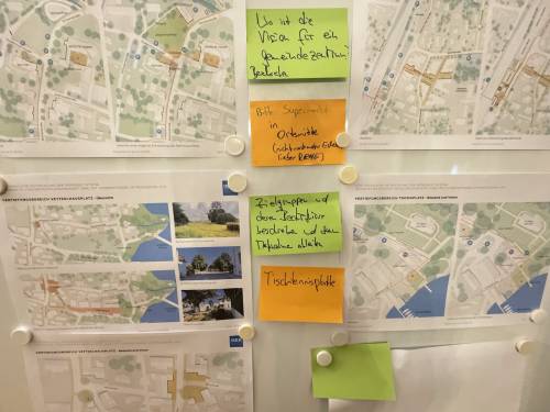 Allerlei Kommentare und Anmerkungen wurden auf Zettel geschrieben und an die Wände geklebt. Da reichte das Spektrum von einem Gemeindezentrum über eine bessere Beleuchtung der Brahmspromenade bis zu Tischtennisplatten. Anschließend in einer Schlussrunde versuchten die Planerinnen ein Resümee zu ziehen.