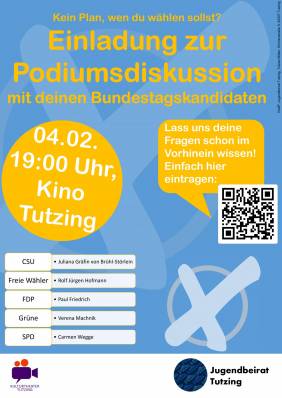 Der Jugendbeirat Tutzing und die Direktkandidaten des Wahlkreises Starnberg freuen sich auf Ihr Erscheinen und Ihre motivierte Teilnahme.